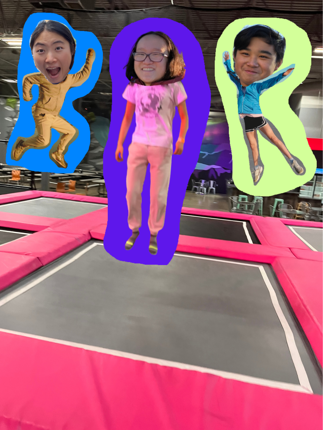 On my half birthday, the three of us arrive to the personable attendant, Nahmere, who, to our shock, gifts us $12 tickets and a one-cent upgrade to membership-level. Dressed in a striped referee work uniform, he looks about our age, maybe even younger, catching our eyes in a wry smile. We ready our neon-green wristbands conspiratorially, slipping on our grip socks, and head into a stampede of backflips and exclaiming children. At first, I feel like a toddling Mona Lisa, my eyes moving imperceptibly to answer the questions of my memories. As I habitually think of everything that could go wrong, I watch with a detached unknowingness at the carefree spirit these hoppers unleash without worry. My perpetual scowl breaks out into a tiny smile, the 3 of us facing each other as we wordlessly achieve new heights. As I hop from trampoline to trampoline, I absorb their springy courage like how Black Panther’s vibranium absorbs kinetic energy. With each new unleashed grin, I begin to see everything that could go right instead.